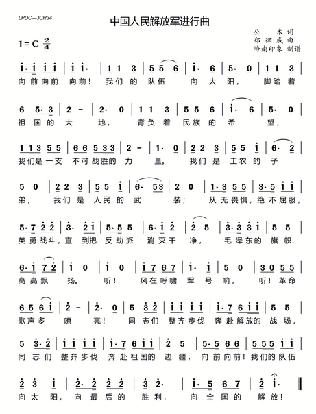 中國(guó)人民解放軍軍歌,歌名為《中國(guó)人民解放軍進(jìn)行曲》,由公木作詞,鄭律成作曲,創(chuàng)作于1939年。