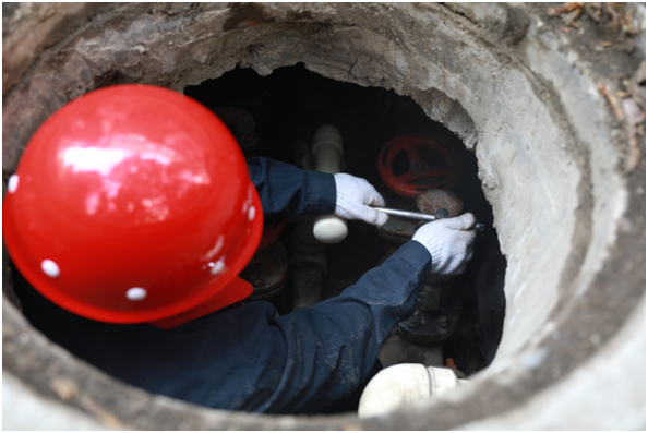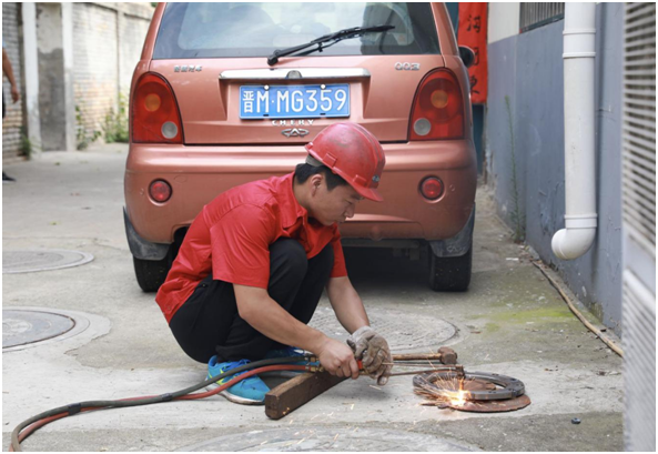 大暑節(jié)氣,天氣有些悶熱,最高氣溫超過36度。位于薈萃北區(qū)的一棟樓前,運(yùn)行經(jīng)營(yíng)一分公司兩名穿著工作服的檢修人員揭開檢查井蓋進(jìn)行通風(fēng)換氣,系緊褲腳、戴好安全帽……做好下井準(zhǔn)備工作后,一點(diǎn)一點(diǎn)把身子探進(jìn)檢查井,工作人員在狹窄的檢查井中對(duì)到樓鎖閉閥門進(jìn)行維護(hù)保養(yǎng)。“機(jī)油槍遞給我”,狹窄的井口內(nèi),李鵬蜷縮其中,抬起掛滿汗水的臉喊道。檢查井深約3米,內(nèi)部空間狹小,最多能容納2人,在井里作業(yè),隨時(shí)會(huì)發(fā)生磕碰。在有限的作業(yè)空間內(nèi),檢修員無法伸直手臂,只能依靠腕力打開鎖頭,查看閥門狀態(tài),閥門開關(guān)是否老化損壞,管道盤根是否泄漏,接著用機(jī)油槍注入機(jī)油潤(rùn)滑并抹油,扭動(dòng)活動(dòng)閥門,進(jìn)行回絲、鎖頭,一步一步對(duì)鎖閉閥管道進(jìn)行保養(yǎng)并清理井室內(nèi)雜物……