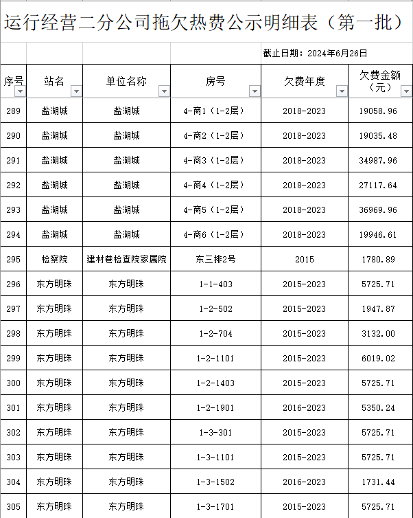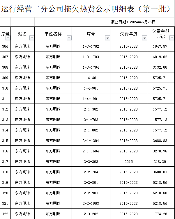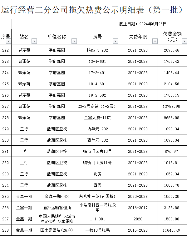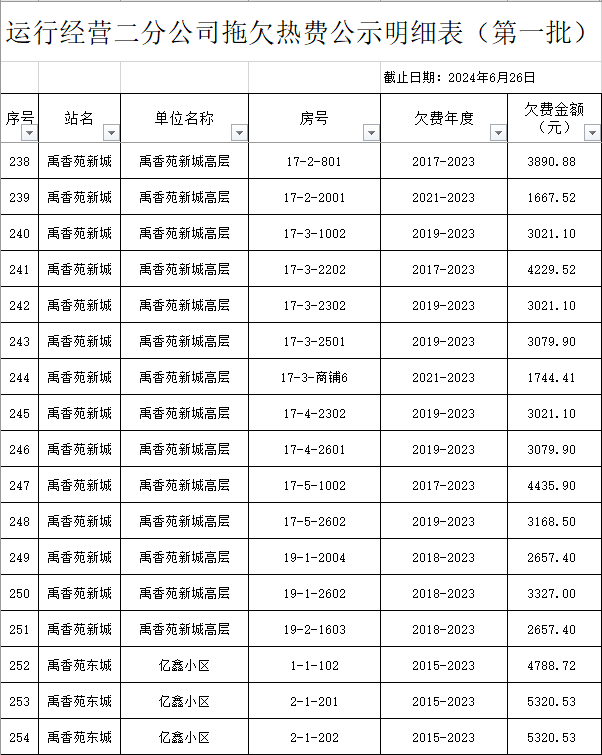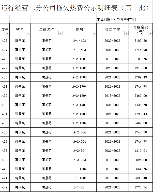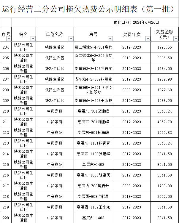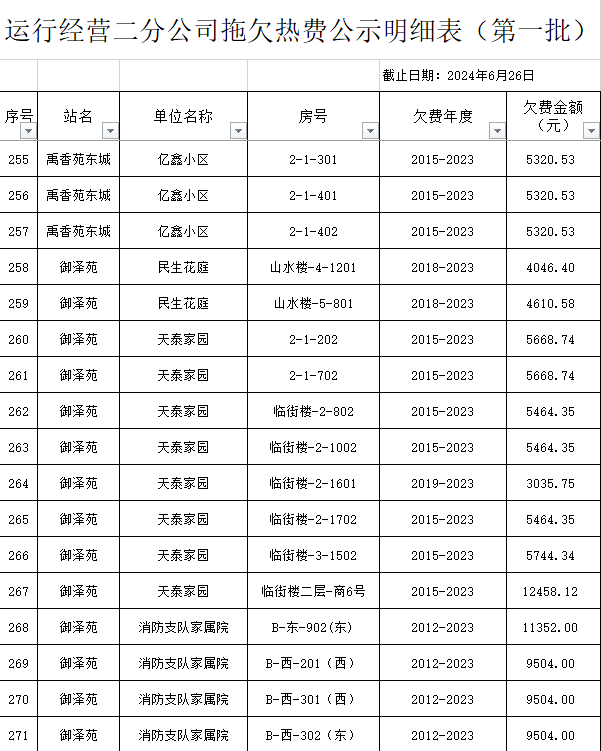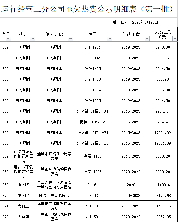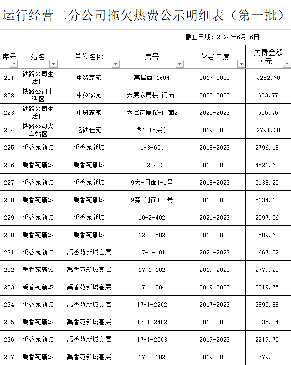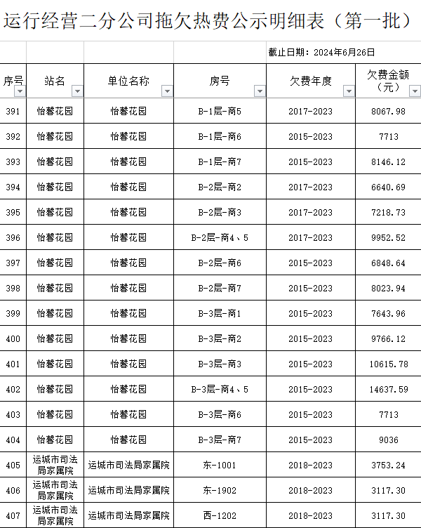 根據(jù)《運(yùn)城市中心城區(qū)集中供熱管理暫行辦法》第二十五條及運(yùn)價(jià)管字【2009】199號(hào)《關(guān)于明確集中供熱收費(fèi)有關(guān)問(wèn)題的通知》第一項(xiàng)“城市供熱實(shí)行繳費(fèi)用熱的原則”,截至目前,仍有部分用戶未繳納2023年度及以前年度熱費(fèi),直接影響了供熱企業(yè)正常生產(chǎn)運(yùn)行。為了加快欠費(fèi)回籠,確保供熱企業(yè)生產(chǎn)運(yùn)行,請(qǐng)下列欠費(fèi)的用戶,在2024年10月30日之前交清拖欠熱費(fèi)。否則,供熱企業(yè)有權(quán)依法維護(hù)自身權(quán)益,拖欠用戶將承擔(dān)相應(yīng)的責(zé)任和由此造成的一切后果。也通過(guò)媒體公示,讓社會(huì)監(jiān)督,讓我們共同行動(dòng),共同營(yíng)造良好供熱運(yùn)營(yíng)環(huán)境和氛圍,為廣大居民溫暖過(guò)冬發(fā)揮各自應(yīng)有的作用。