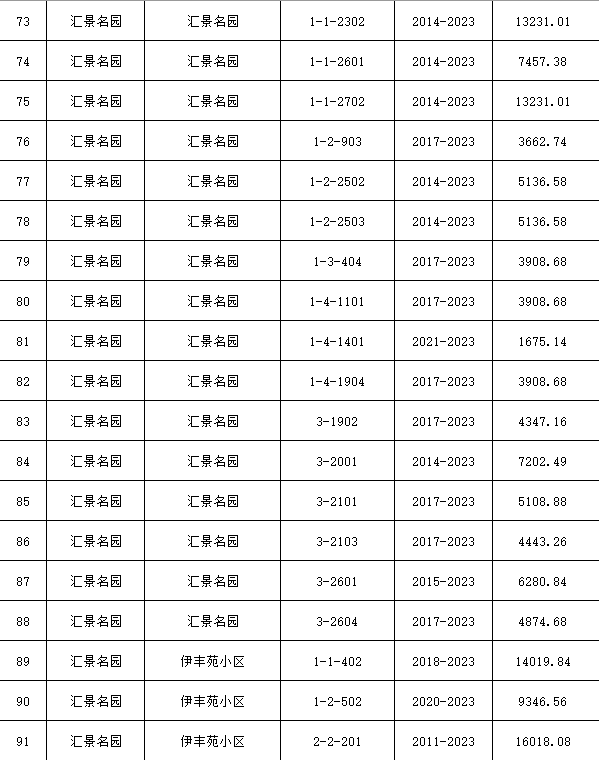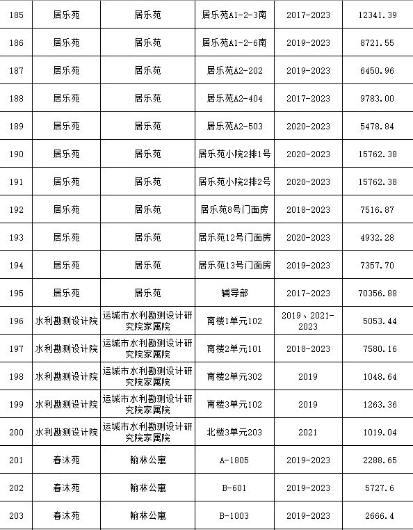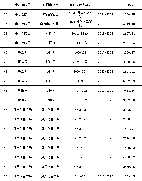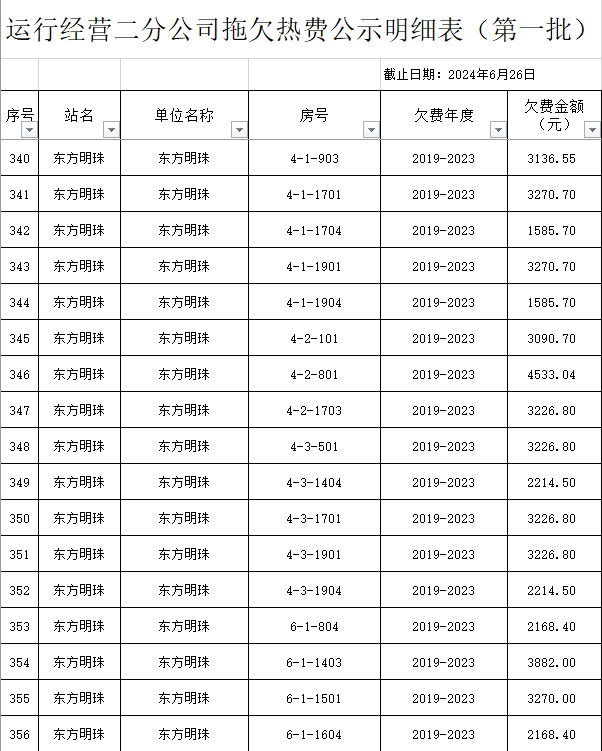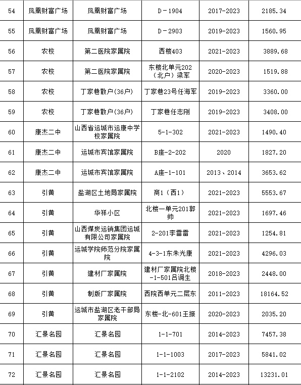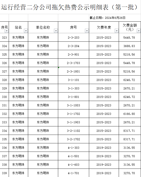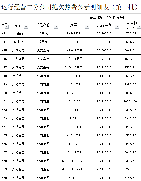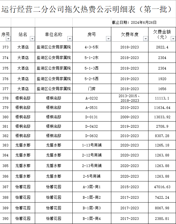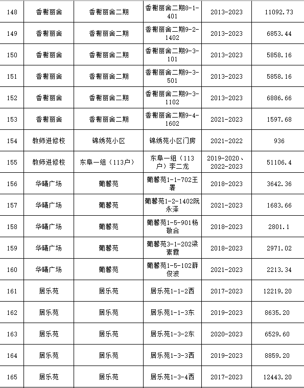 根據(jù)《運(yùn)城市中心城區(qū)集中供熱管理暫行辦法》第二十五條及運(yùn)價(jià)管字【2009】199號(hào)《關(guān)于明確集中供熱收費(fèi)有關(guān)問(wèn)題的通知》第一項(xiàng)“城市供熱實(shí)行繳費(fèi)用熱的原則”,截至目前,仍有部分用戶未繳納2023年度及以前年度熱費(fèi),直接影響了供熱企業(yè)正常生產(chǎn)運(yùn)行。為了加快欠費(fèi)回籠,確保供熱企業(yè)生產(chǎn)運(yùn)行,請(qǐng)下列欠費(fèi)的用戶,在2024年10月30日之前交清拖欠熱費(fèi)。否則,供熱企業(yè)有權(quán)依法維護(hù)自身權(quán)益,拖欠用戶將承擔(dān)相應(yīng)的責(zé)任和由此造成的一切后果。也通過(guò)媒體公示,讓社會(huì)監(jiān)督,讓我們共同行動(dòng),共同營(yíng)造良好供熱運(yùn)營(yíng)環(huán)境和氛圍,為廣大居民溫暖過(guò)冬發(fā)揮各自應(yīng)有的作用。